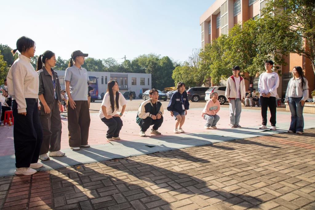 “屹立不倒”中,队员们围圈移动、接力握杆,完成了一次次默契的传递。