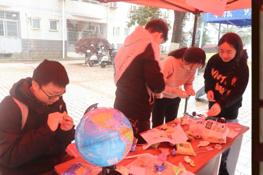 白天的升华广场,雨声与笑语交织。知识问答与抽奖区域前人头攒动,同学们围绕生态保护、能源利用、低碳生活等主题题目展开思考,或独自沉思,或三五成群交流。小小的奖品承载着环保的期许,激励着大家将绿色理念带回到日常生活中。