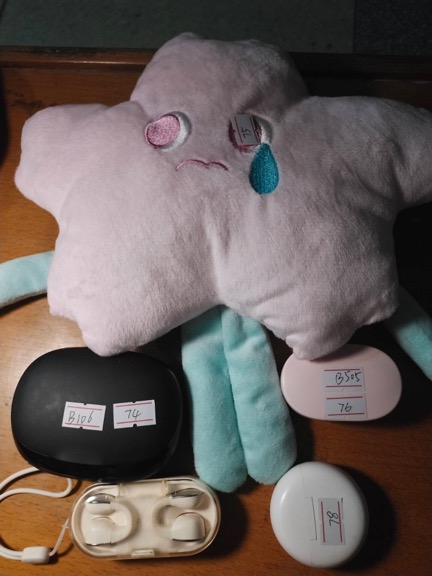 蓝牙耳机(黑色,内有1只耳机;粉色,内有2只耳机,黄色,SANSUI,内有2只耳机;白色,圆形,内有2只耳机),玩偶(五角星形,粉色)