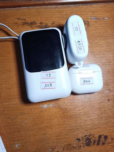 蓝牙耳机(白色耳机套,内有两只耳机,Jabra,黑色外壳;白色,内有一只耳机),充电宝(白色,10000毫安,自带三线)