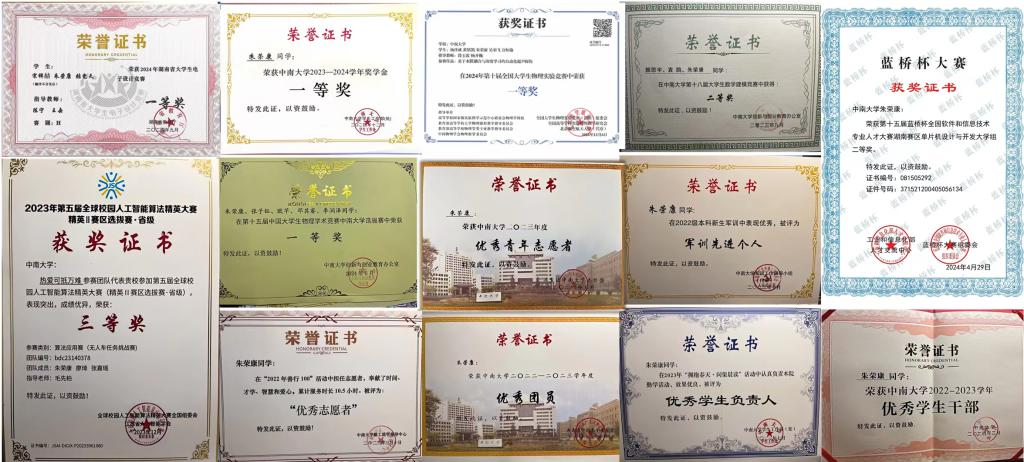 在躬身实践的漫漫长路中,朱荣康坚信“纸上得来终觉浅,绝知此事要躬行”,一直致力于将理论知识与实际操作紧密结合。他踊跃投身各类竞赛,在创新实践中不断乘风破浪,披荆斩棘。在2024年,他斩获全国大学生物理实验竞赛国家级一等奖、全国大学生电子设计竞赛省级一等奖、蓝桥杯省级二等奖等多项高含金量奖项,这些成果正是他扎实专业知识与创新精神的有力见证,彰显了其在学术道路上的卓越实力与无限潜力。