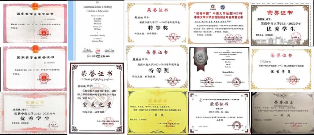 在科研创新领域成绩斐然的邵琪涵,在学科竞赛中也同样展现出卓越的才能。她参加了2024年美国大学生数学建模竞赛,在竞赛中主要负责对七鳃鳗所处生态系统进行数学建模,并运用Matlab对所建模型进行编程以输出最终结果,最终荣获Meritorious Winner奖项。此外,她作为核心成员参与了“正大杯”全国大学生市场调查与分析大赛。期间,她主要负责建立模型并编程分析电动汽车销量的影响因素,运用Logistic非线性回归对电动汽车未来销量进行预测。在第十四届中国大学生物理学术竞赛中,她基于所给题目选择研究欧拉摆,主要负责依据理论分析设计相应实验研究,探究了磁化面积、木板厚度、磁棒长度对欧拉摆的影响,并将实验结果与数值仿真进行比较验证,最终获得校级一等奖。另外,她还获得了第十三届APMCM亚太地区大学生数学建模竞赛国家级二等奖、第四届MathorCup高校数模挑战赛国家级二等奖、先进飞行器虚拟仿真大赛校级二等奖等。