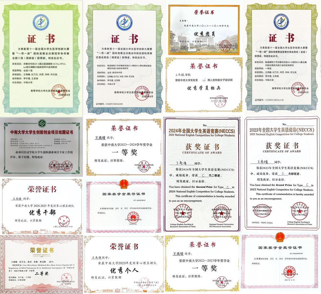 李宇晟(中南大学湘雅医院研究员,研究生部主任):王禹曈同学在校期间表现突出,具备出色的综合素养。学业上勤奋刻苦,成绩名列前茅;科研竞赛中勇于探索,取得优异的成果;积极参与社会实践,反馈良好。期望其未来能秉持初心,在医学道路上砥砺前行,成长为担当重任的医学人才。