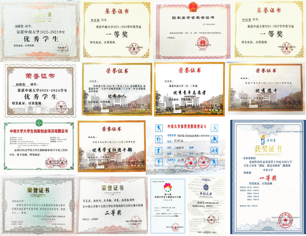 许源源(中南大学公共管理学院院长,教授):向欣怡同学思想道德品质优良,积极上进,踏实勤奋,学习成绩优异;她认真负责,积极参与学生工作与社会实践,在生活中团结同学,尊敬师长,是一位全面发展的优秀学生。