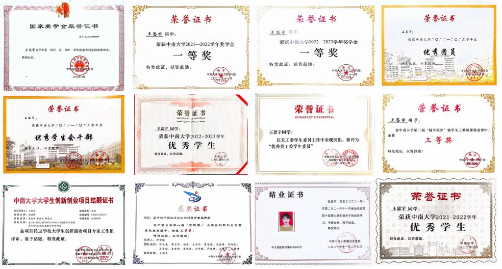 王思宇,女,汉族,2003年4月生,中共党员,中南大学湘雅公共卫生学院预防医学专业2021级本科生,入学以来专业排名第一(1/112),专业核心课程90分及以上比例逾60%,曾获得国家奖学金、学年一等奖学金、优秀学生干部标兵等校级及以上荣誉十余项。